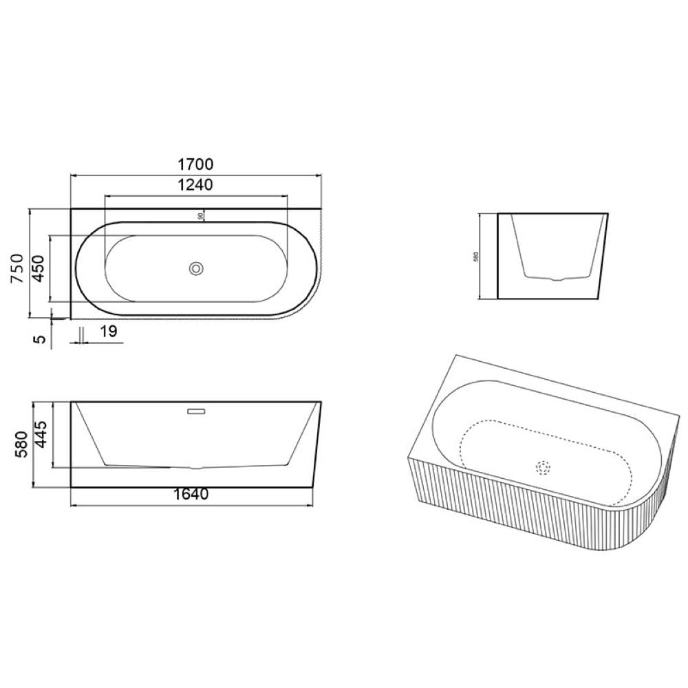 Wanna wolnostojąca przyścienna ryflowana Rio 504D lewa biała 170 x 75 cm przelew chrom