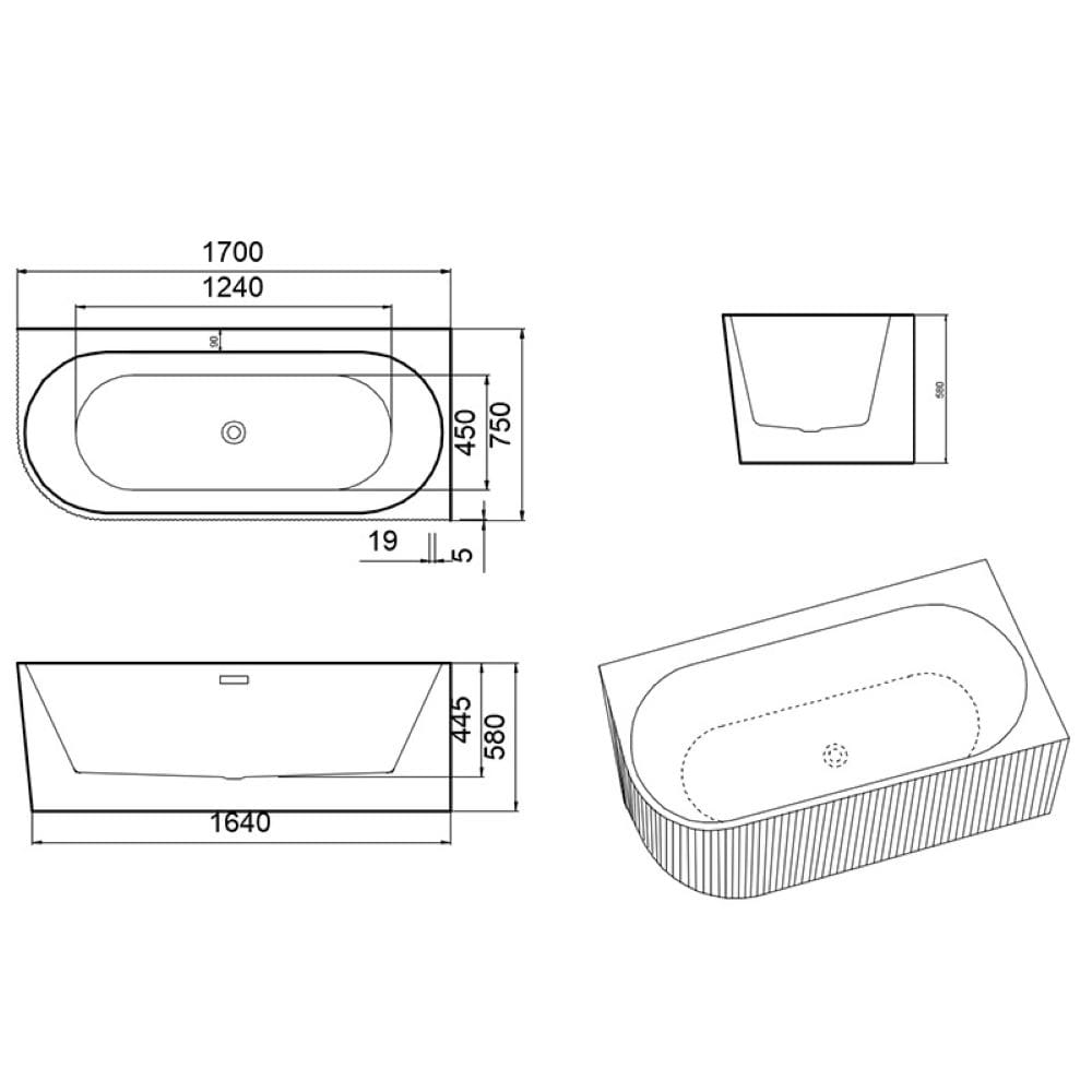 Wanna wolnostojąca przyścienna ryflowana Rio 504D prawa biała 170 x 75 cm przelew złoty