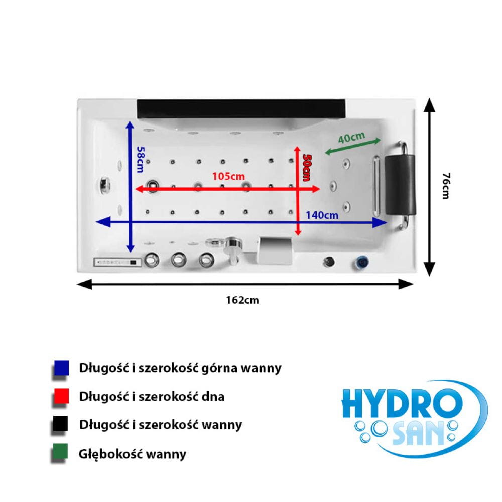Wanna SPA marki Hydrosan to doskonałe połączenie wysokiej jakości wykonania, innowacyjnych rozwiązań i fantastycznego wzornictwa. Decydując się na wannę marki Hydrosan, wprowadzisz do swojej łazienki połączenie trwałości, jakości, najnowszych technologii i ponadczasowej elegancji, które zachwycą Ciebie i Twoich gości. Wanna SPA Hydrosan to luksusowa propozycja, która zapewni niezapomniane doznania podczas kąpieli. Ta przestronna wanna została zaprojektowana z myślą o maksymalnym komforcie i relaksie. Nasza wanna wyposażona jest w zaawansowany system hydromasażu, wanna posiada różnorodne dysze, które zapewniają kompleksową i indywidualnie dostosowaną terapię wodną, dysze Hydro Jeet skupiają się na masażu pleców, co daje wrażenie odprężającego i kojącego hydromasażu. Wanna jest napędzana przez pompy. Wanna jest na stelażu ze stali nierdzewnej. Wannę wyposażono w zabezpieczenia przed przebiciem oraz przegrzaniem pompy.