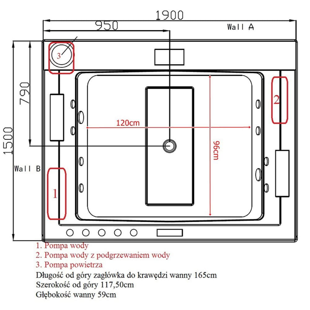| Pompy | pompa wirowa (wodna) 2HP (1500W); pompa wirowa wodna 1HP (750W); pompa powietrzna 0,60HP jacuzzi; podgrzewanie wody 1,5KW (1500W) |