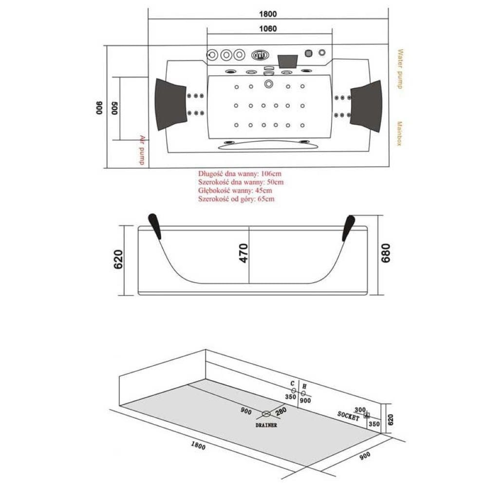 Pompy pompa wirowa (wodna) 1.5HP (1100W); pompa powietrzna 400W (0,50HP) jacuzzi; podgrzewacz wody 1,5KW (1500W)