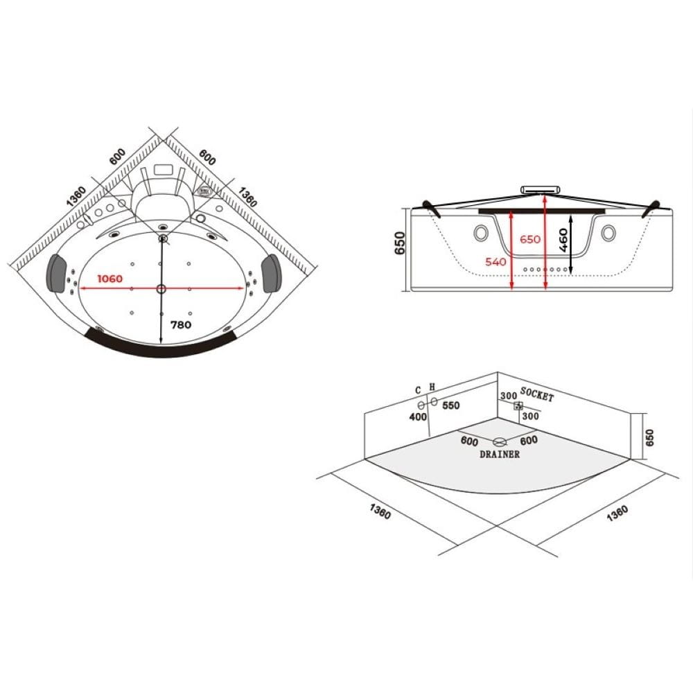 | Pompy | pompa wirowa (wodna) 1.5HP (1100W); pompa powietrzna 0.25HP (250W) jacuzzi; podgrzewanie wody 1,5 kW |