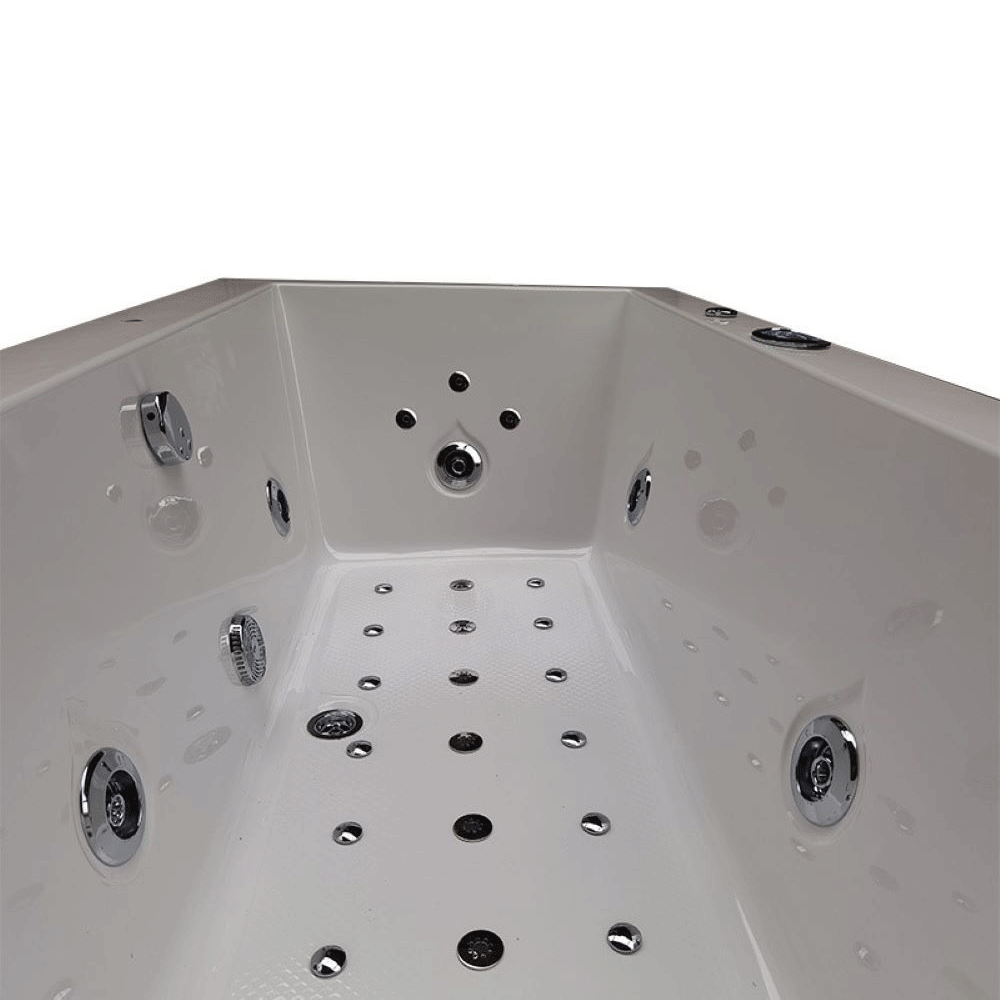 Wanna SPA marki Hydrosan to doskonałe połączenie wysokiej jakości wykonania, innowacyjnych rozwiązań i fantastycznego wzornictwa. Decydując się na wannę marki Hydrosan, wprowadzisz do swojej łazienki połączenie trwałości, jakości, najnowszych technologii i ponadczasowej elegancji, które zachwycą Ciebie i Twoich gości. Wanna SPA Hydrosan to luksusowa propozycja, która zapewni niezapomniane doznania podczas kąpieli. Ta przestronna wanna została zaprojektowana z myślą o maksymalnym komforcie i relaksie. Nasza wanna wyposażona jest w zaawansowany system hydromasażu, wanna posiada różnorodne dysze, które zapewniają kompleksową i indywidualnie dostosowaną terapię wodną, dysze Hydro Jeet skupiają się na masażu pleców, co daje wrażenie odprężającego i kojącego hydromasażu. Wanna jest napędzana przez pompy. Wanna jest na stelażu ze stali nierdzewnej.