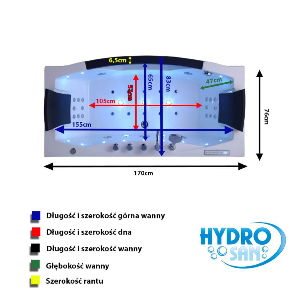 Wanna SPA marki Hydrosan to doskonałe połączenie wysokiej jakości wykonania, innowacyjnych rozwiązań i fantastycznego wzornictwa. Decydując się na wannę marki Hydrosan, wprowadzisz do swojej łazienki połączenie trwałości, jakości, najnowszych technologii i ponadczasowej elegancji, które zachwycą Ciebie i Twoich gości. Wanna SPA Hydrosan to luksusowa propozycja, która zapewni niezapomniane doznania podczas kąpieli. Ta przestronna wanna została zaprojektowana z myślą o maksymalnym komforcie i relaksie. Nasza wanna wyposażona jest w zaawansowany system hydromasażu, wanna posiada różnorodne dysze, które zapewniają kompleksową i indywidualnie dostosowaną terapię wodną, dysze Hydro Jeet skupiają się na masażu pleców, co daje wrażenie odprężającego i kojącego hydromasażu. Wanna jest napędzana przez pompy. Wannę wyposażono w zabezpieczenia przed przebiciem oraz przegrzaniem pompy.