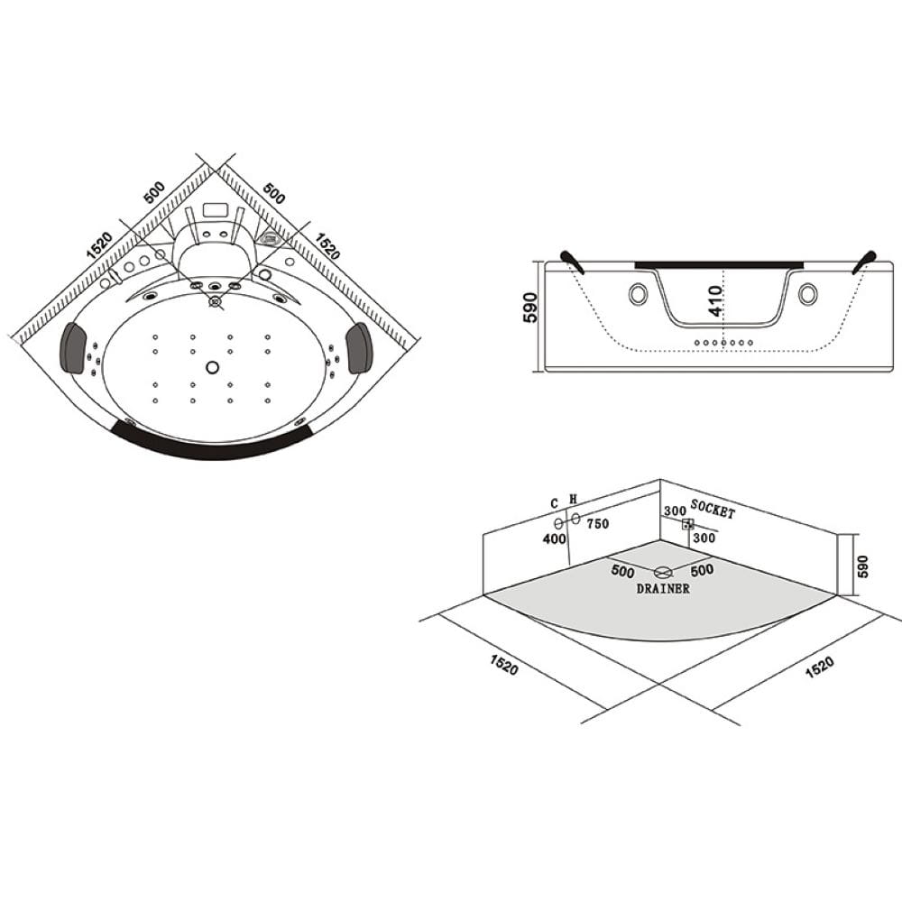 | Pompy | pompa wirowa (wodna) 1.5HP (1100W); pompa powietrzna 0.25HP (250W) jacuzzi; podgrzewanie wody 1,5 kW |