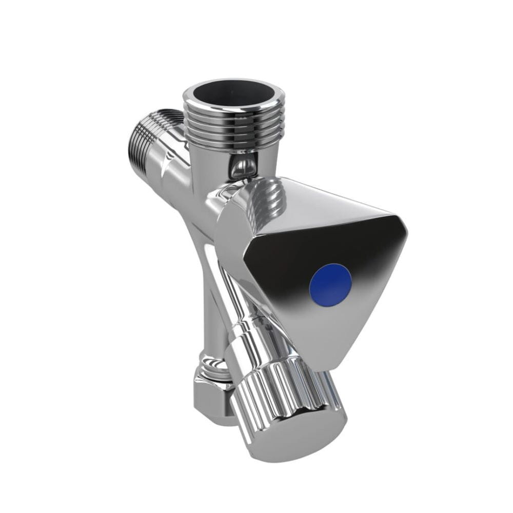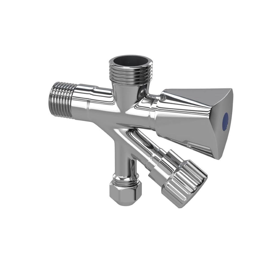 Zawór kątowy podwójny do podłączenia pralki, zmywarki, umywalki.  Wysoka jakość, wykonany z mosiądzu, w kolorze chrom. Głowica ceramiczna. Wyjścia 1/2″x3/4″x3/8″.