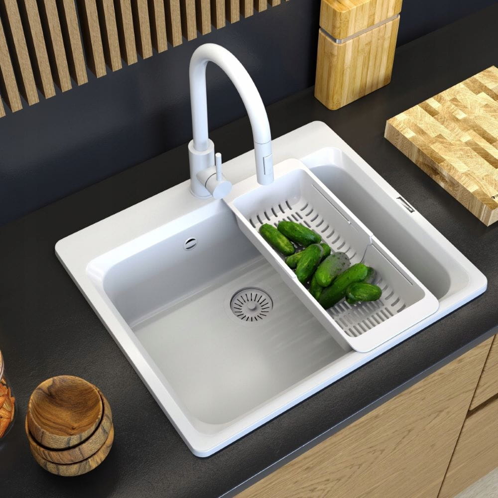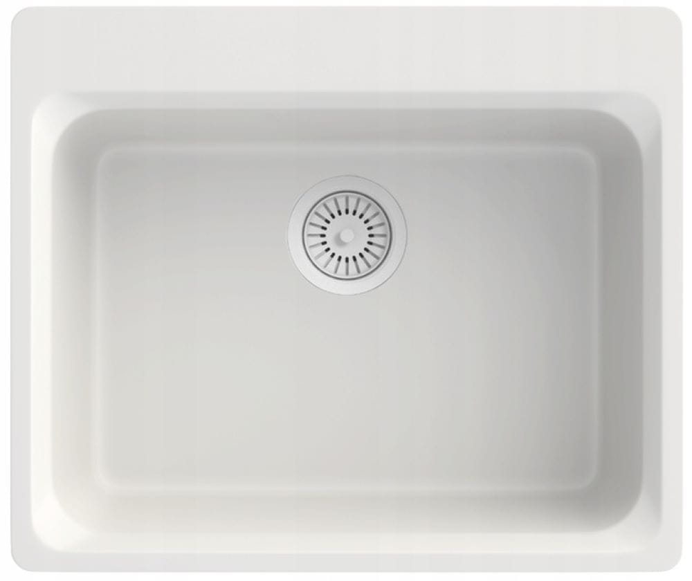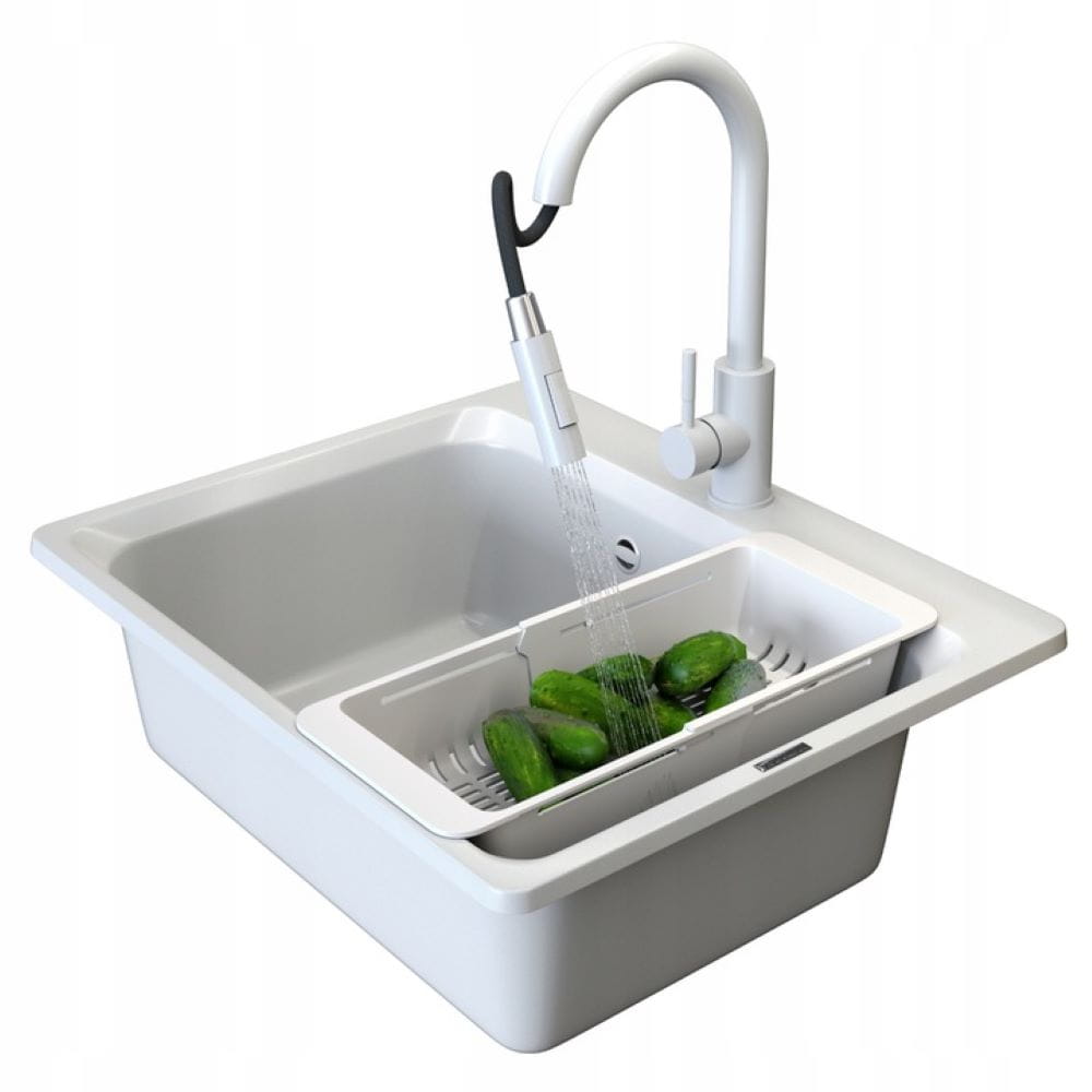 Zestaw - Zlew granitowy Zante biały - bateria Loseto - syfon - koszyk