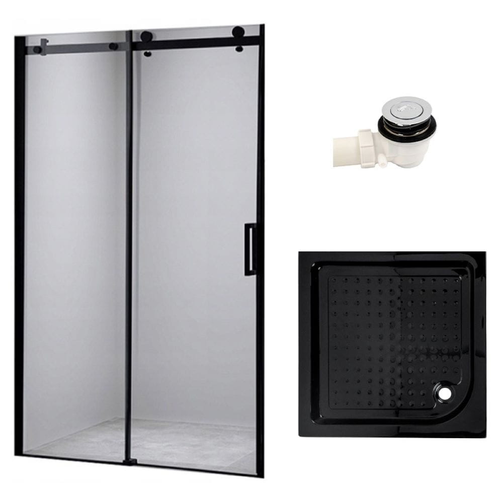 Zestaw - drzwi prysznicowe czarne 95-100 cm 8 mm - brodzik 100x100 cm - syfon klik klak