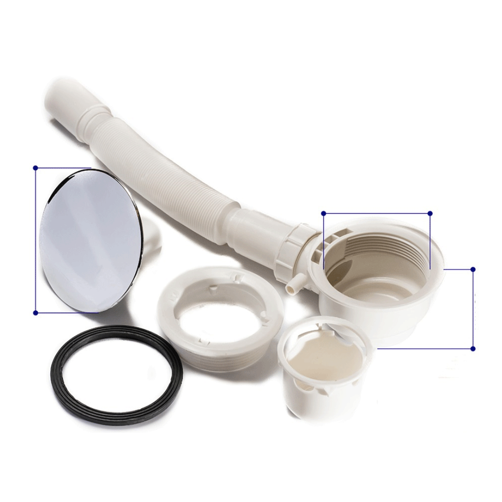 Syfon z uszczelkami. Syfon brodzikowy z elementem umożliwiającym czyszczenie od góry.
