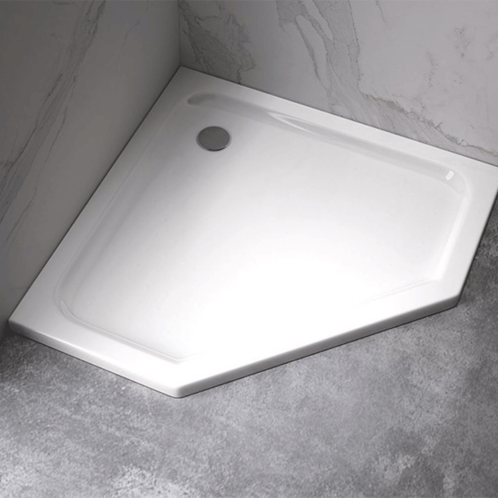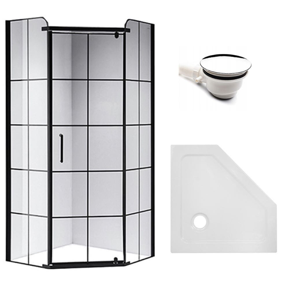Zestaw - kabina prysznicowa pięciokątna 90x90 cm - brodzik - syfon
