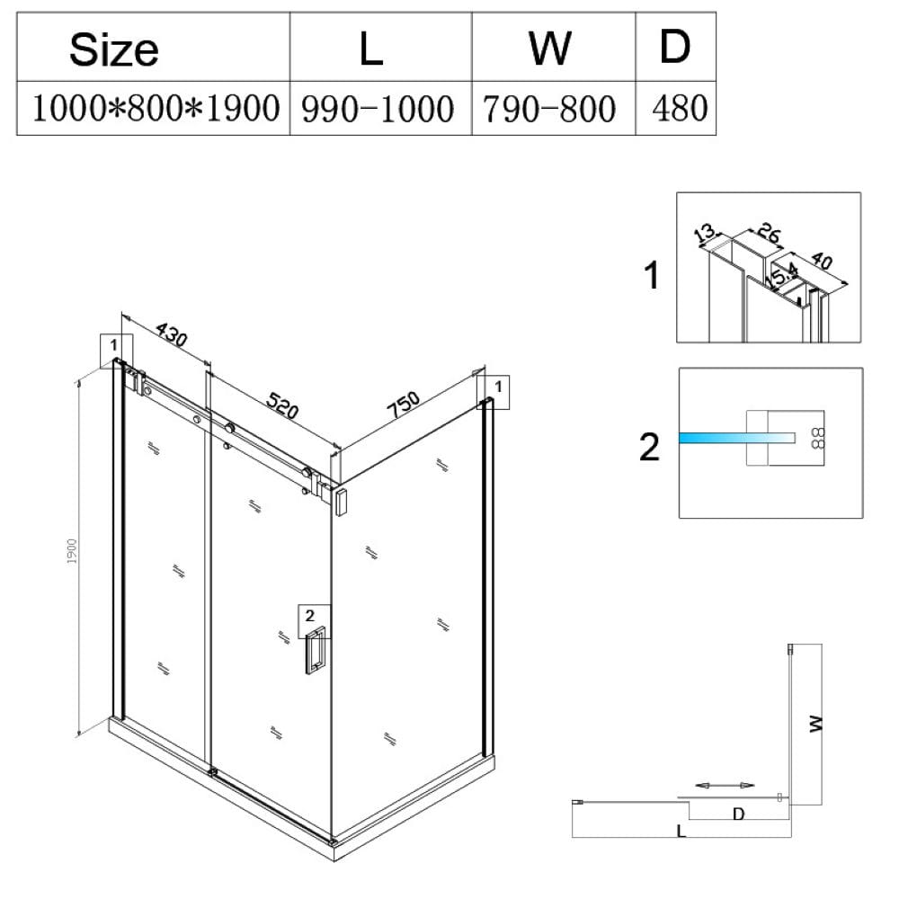 Zestaw zawiera: szyby z technologią NANO GLASS o grubości 8 mm, aluminiowe profile z regulacją 10 mm, mosiężne rolki, stalowe rączki, aluminiowa listwa progowa, uszczelki oraz śruby montażowe.