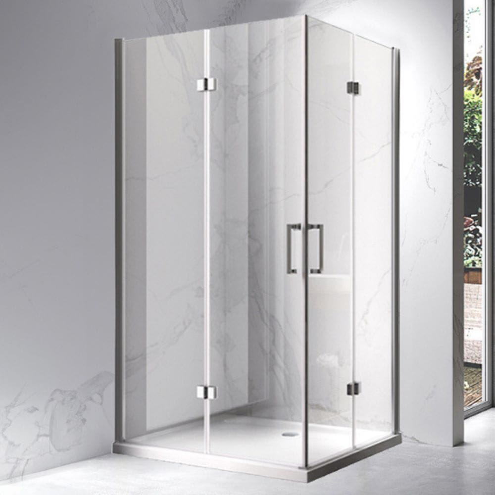 Zestaw zawiera: szyby z technologią NANO GLASS o grubości 6 mm, aluminiowe profile z regulacją 15 mm, stalowe rączki, zestaw uszczelek, śruby montażowe, aluminiowy próg oraz zawiasy do szyb.