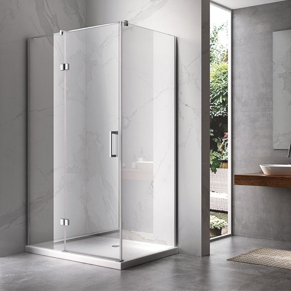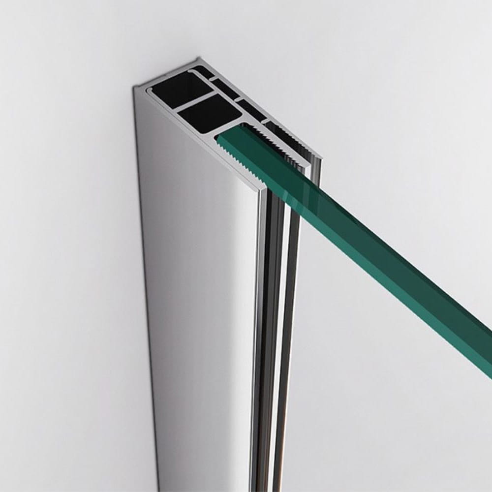 Zestaw zawiera: szyby z technologią NANO GLASS o grubości 6 mm, aluminiowe profile z regulacją 15 mm, stalowe rączki, górne mocowanie ścianek (reling), zestaw uszczelek, śruby montażowe oraz aluminiowy próg.