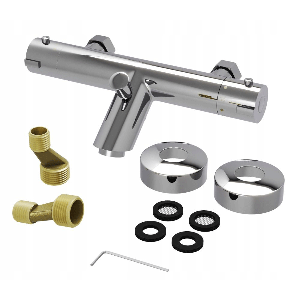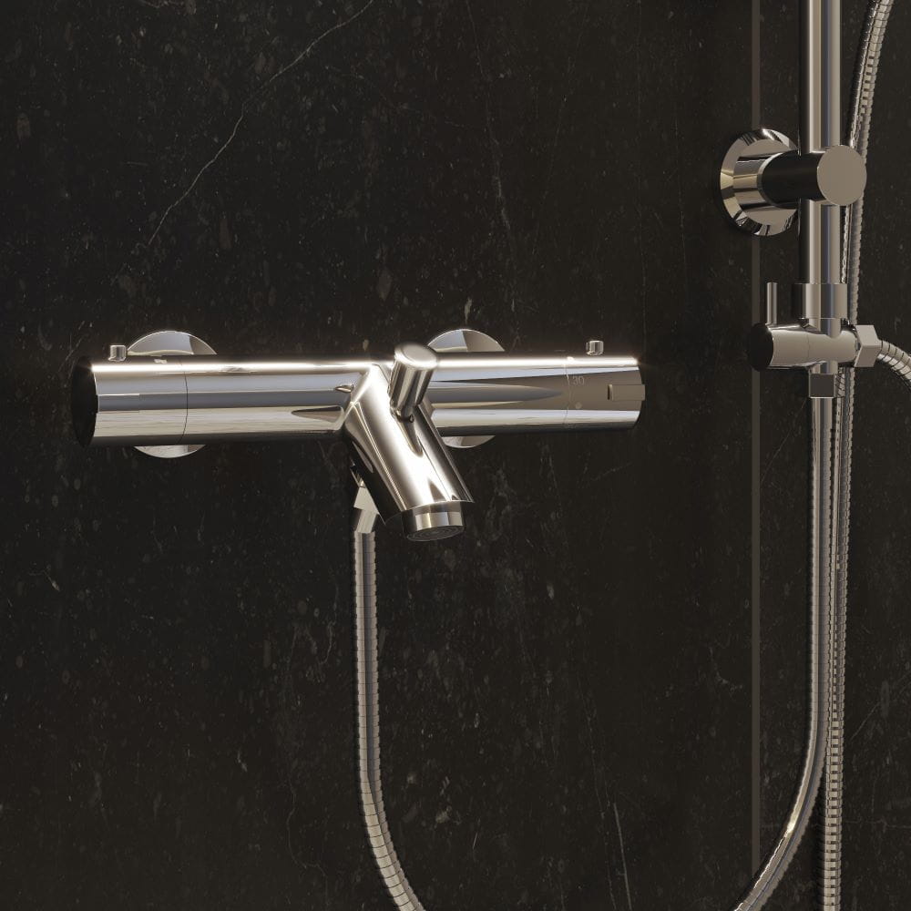 Bateria termostatyczna LATON przeznaczona do montażu ściennego, dwuuchwytowa oraz dwupokrętłowa.