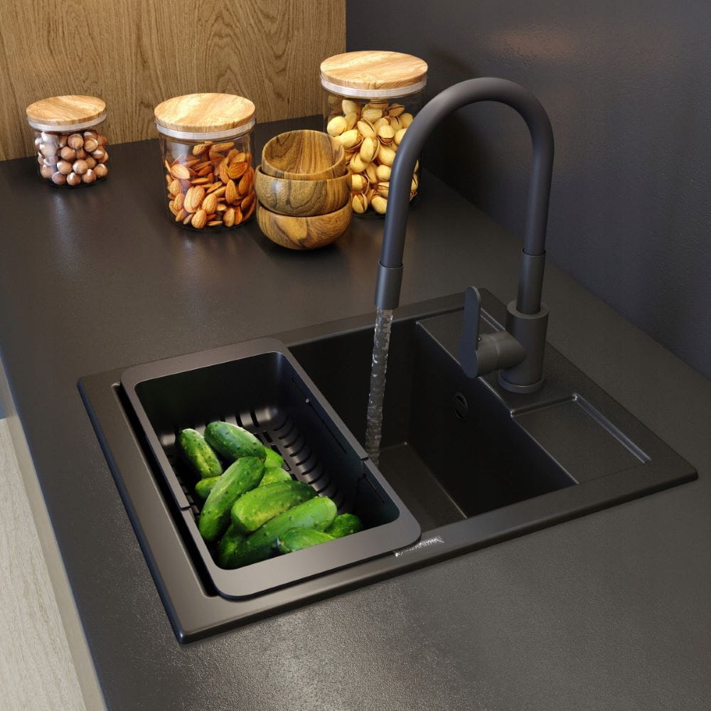Zlewozmywak granitowy czarny - bateria kuchenna Grado - koszyk - zestaw Nero