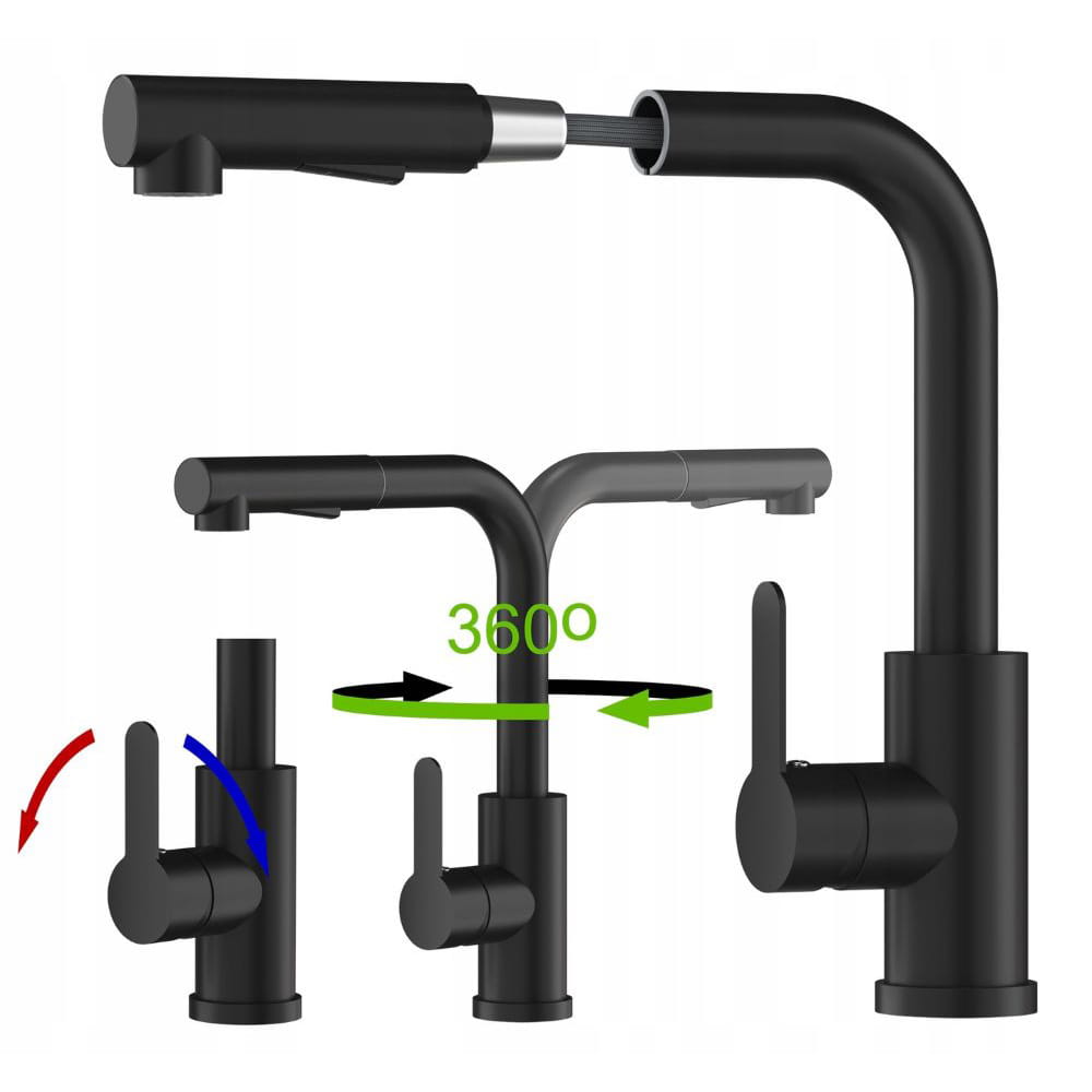 Bateria kuchenna Giro z wyciąganą wylewką czarna 3 strumienie wody