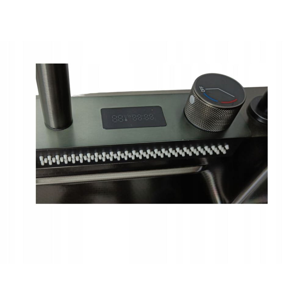 ● Cyfrowy wyświetlacz temperatury wody, który pozwala na dokładne sterowanie temperaturą wody podczas zmywania czy mycia artykułów spożywczych. Dzięki temu codzienne czynności stają się jeszcze wygodniejsze i bezpieczniejsze. Model został wyposażony w designerskie przyciski do sterowania myjką i bateriami kuchennymi. Panel umożliwia wygodne przełączanie pomiędzy poszczególnymi kranami, a co za tym idzie zmianę funkcji i strumienia wody.