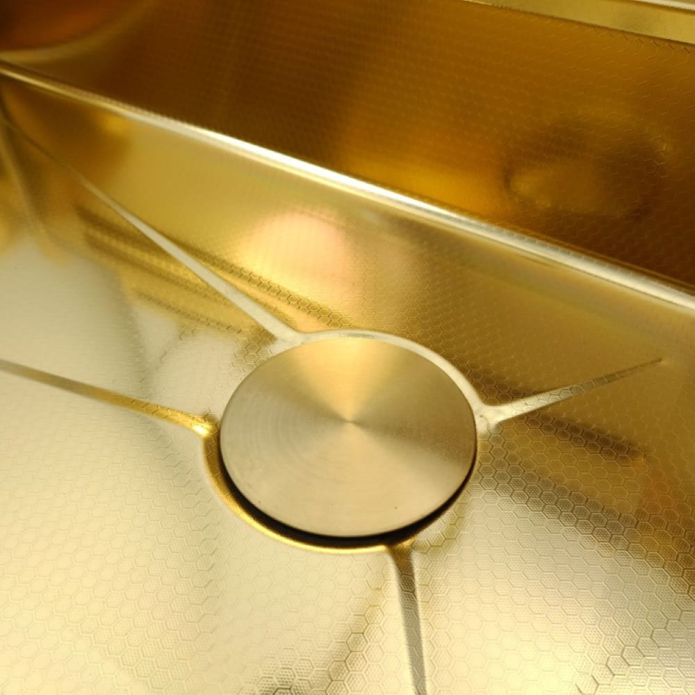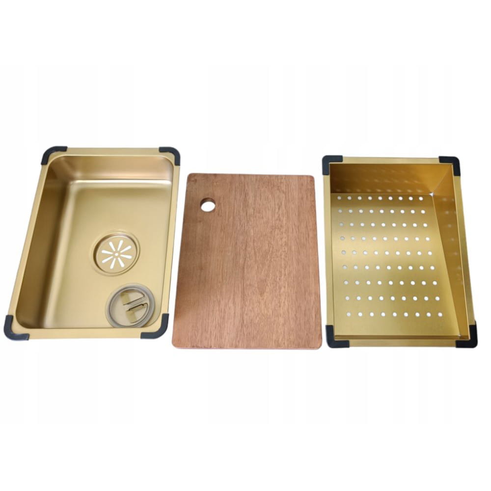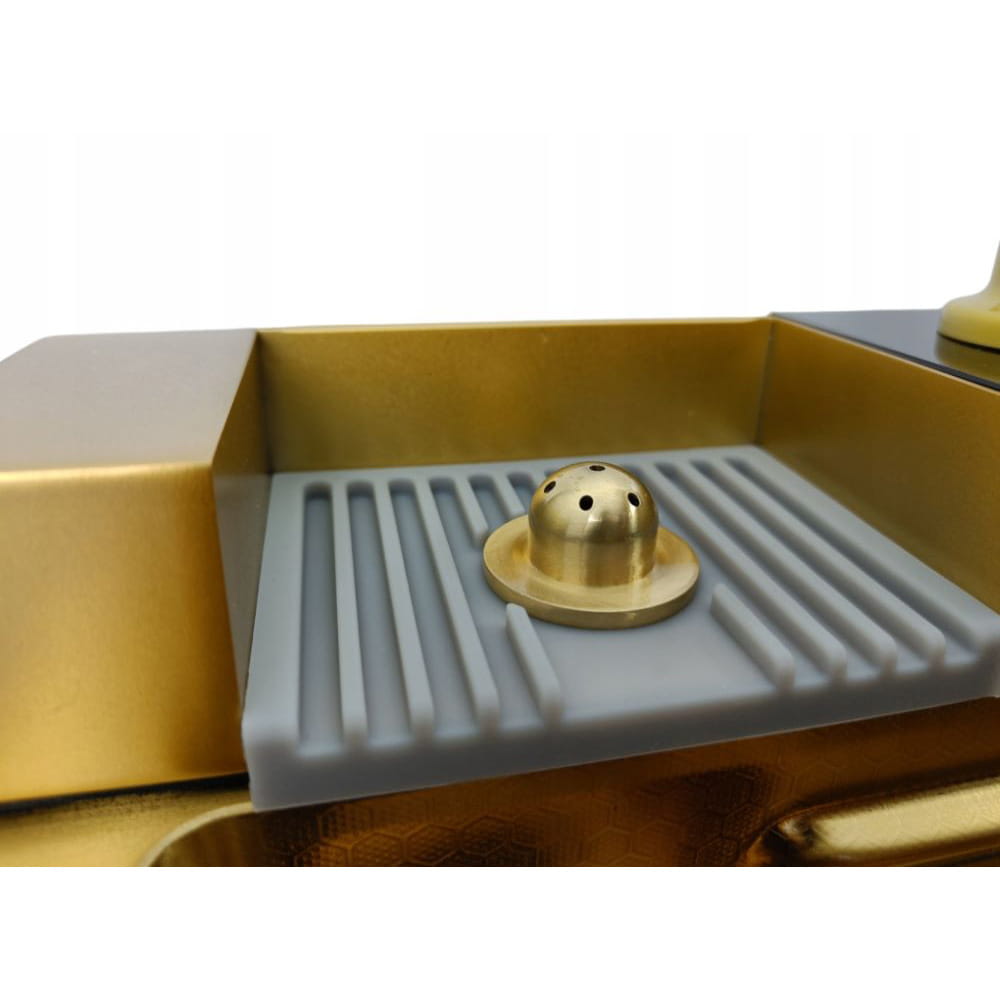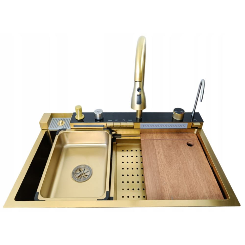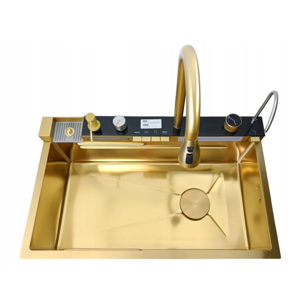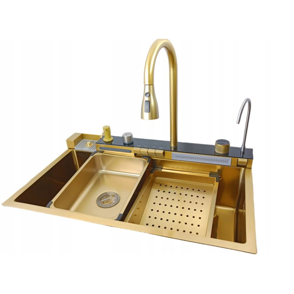 Zlew stalowy złoty - bateria wodospad - myjka - koszyk - dozownik - zestaw Varmo