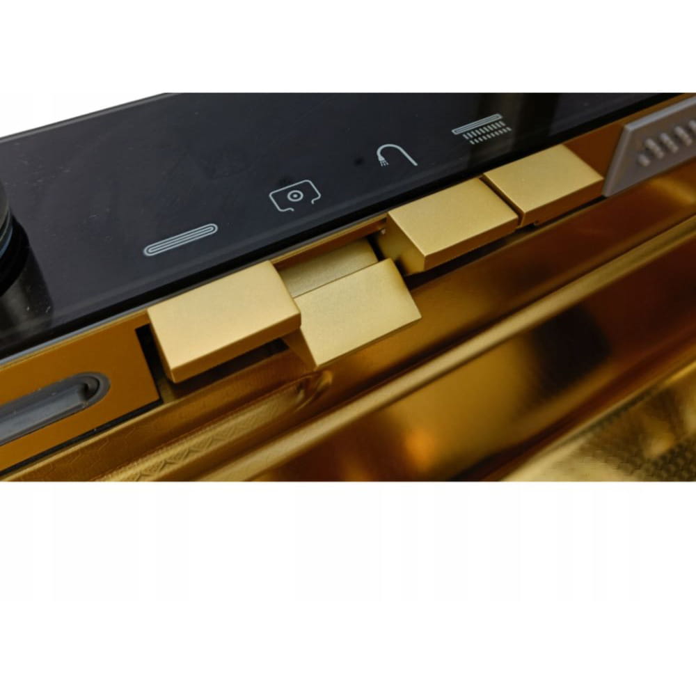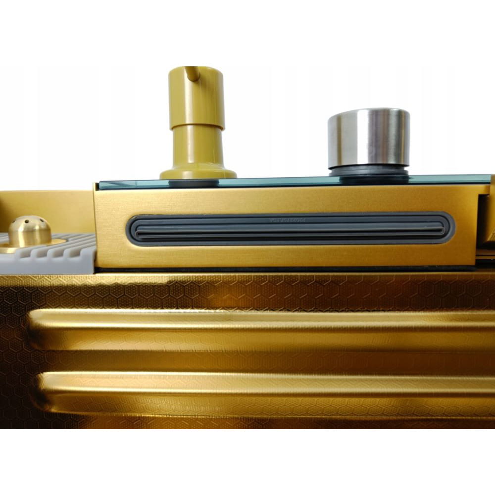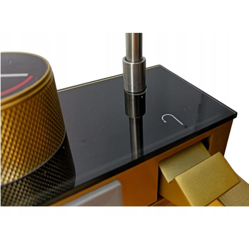 ● Dozownik do płynu naczyń w kolorze złotym. Jest to praktyczne urządzenie, które umożliwia łatwy dostęp do detergentu podczas mycia.