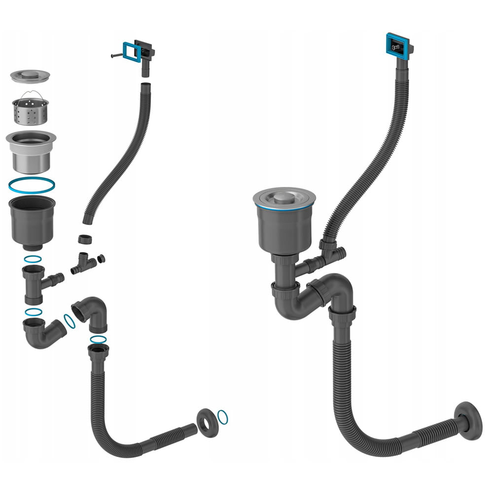 W skład zestawu wchodzą: zlewozmywak, przyścienny syfon manualny w kolorze CHROM z możliwością podłączenia zmywarki lub pralki (oszczędność przestrzeni), mata wygłuszająca zlewozmywak.
