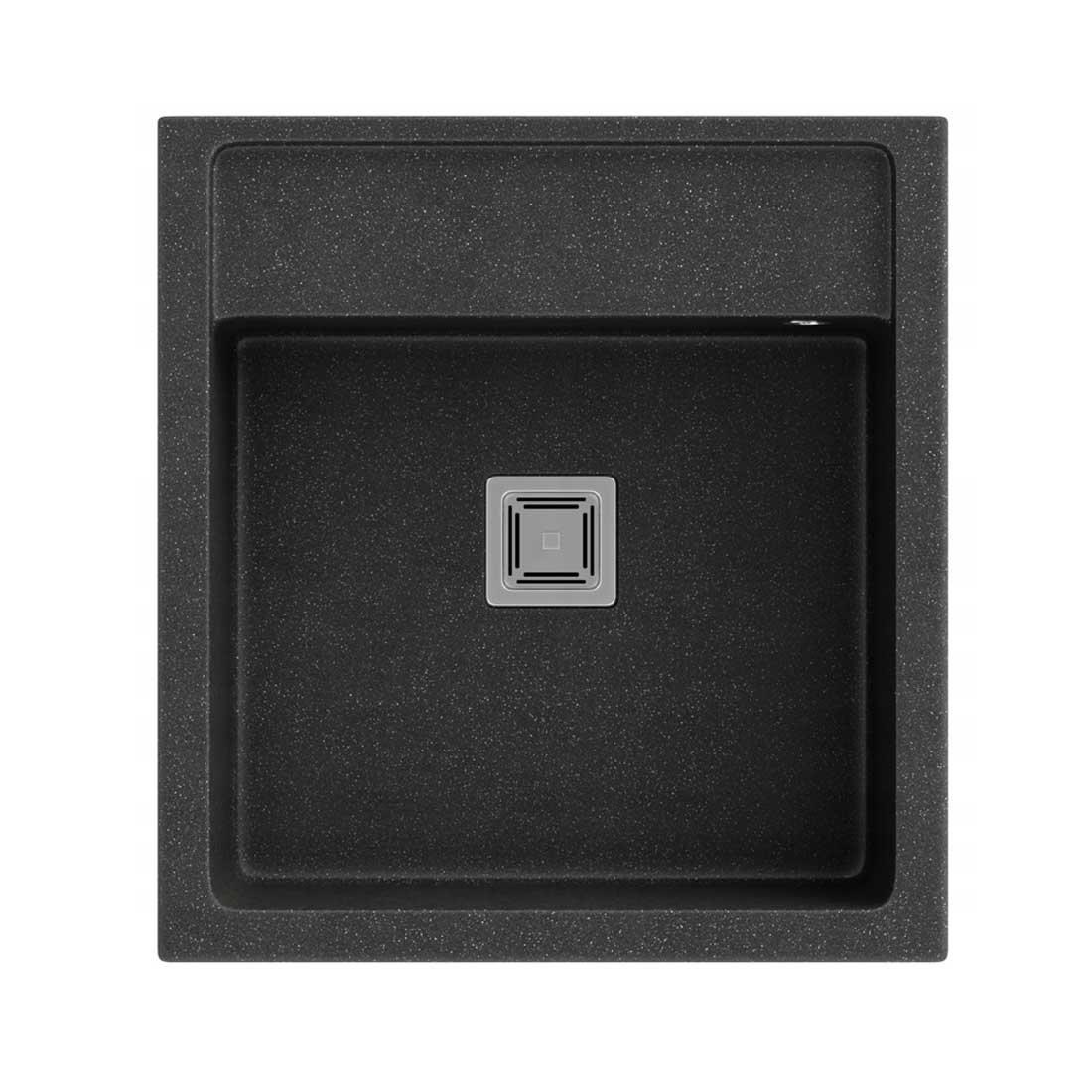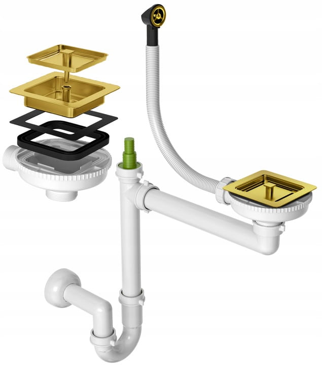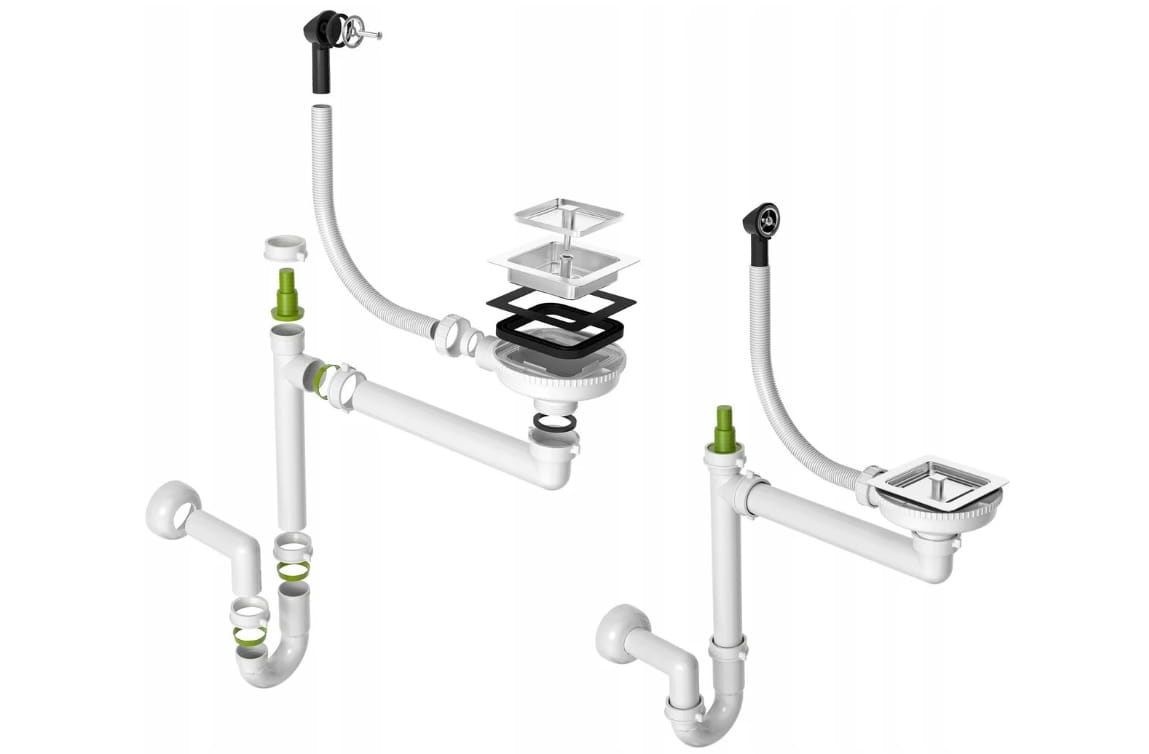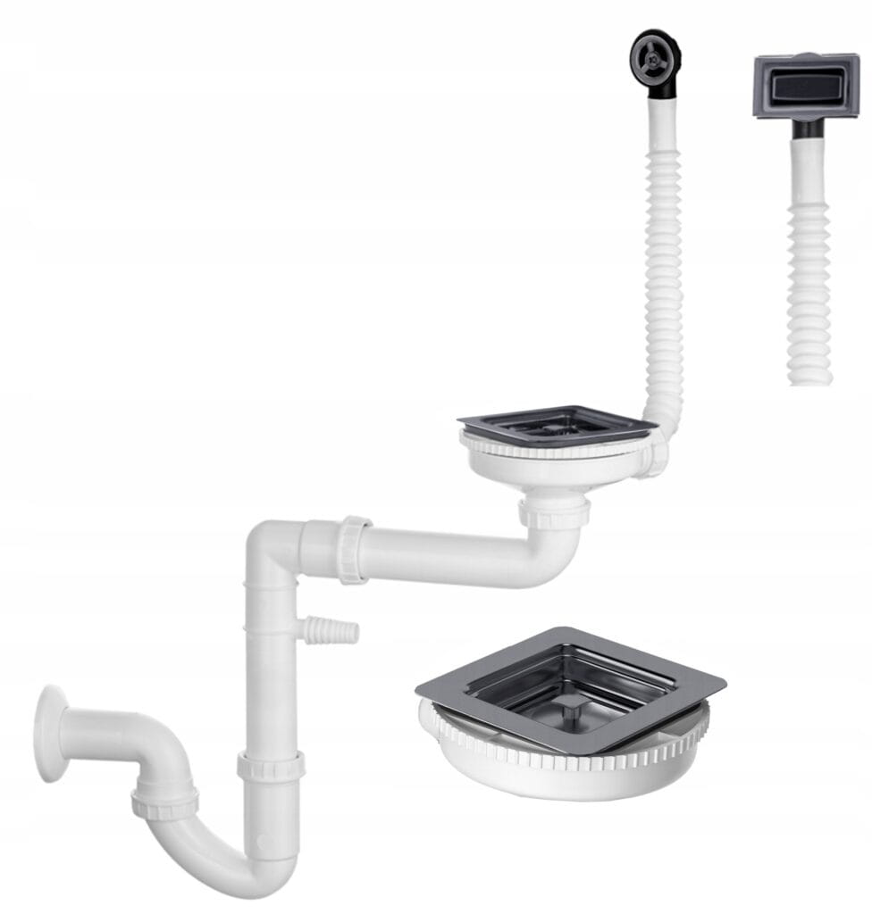Zlewozmywak w zestawie z syfonem przyściennym (oszczędzający miejsce pod szafką) z odpływem kwadratowym.