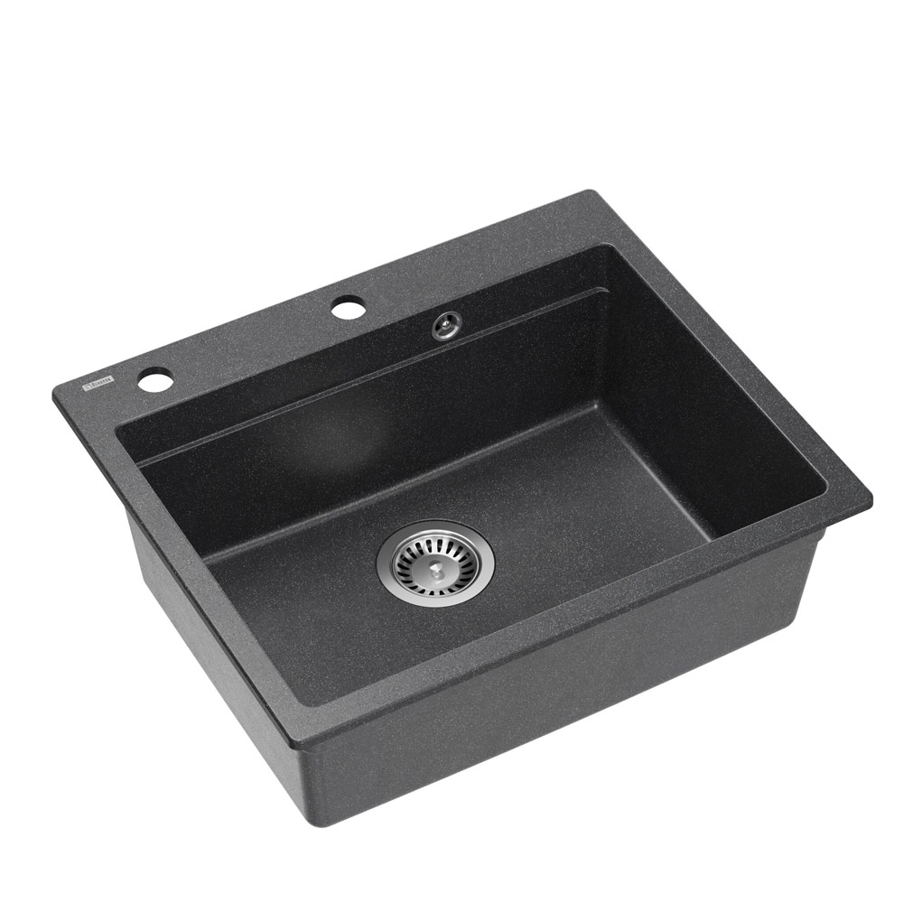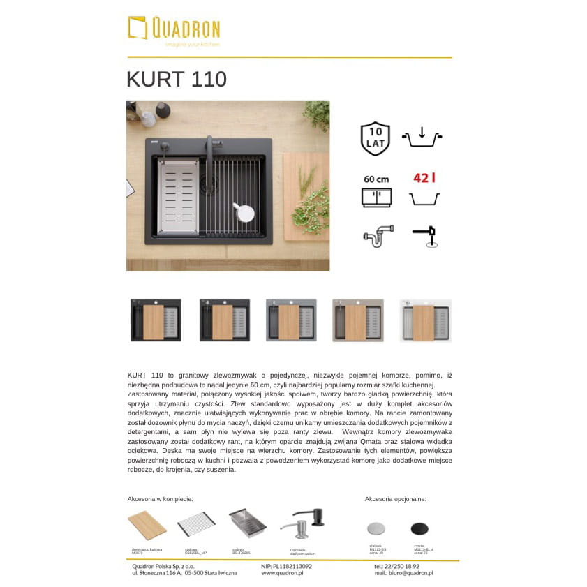 Zlewozmywak granitowy Kurt 110, o pojedynczej, niezwykle pojemnej komorze, model wpuszczany. Dostępny w 5 kolorach: czarny nakrapiany, czarny mat, biały, szaro-beżowy oraz szary. Niezbędna podbudowa to jedynie 60 cm, czyli najbardziej popularny rozmiar szafki kuchennej. Zastosowany materiał, połączony wysokiej jakości spoiwem, tworzy bardzo gładką powierzchnię, która sprzyja utrzymaniu czystości. Zlew standardowo wyposażony jest w duży komplet akcesoriów dodatkowych, znacznie ułatwiających wykonywanie prac w obrębie komory. Na rancie zamontowany został dozownik płynu do mycia naczyń, dzięki czemu unikamy umieszczania dodatkowych pojemników z detergentami, a sam płyn nie wylewa się poza ranty zlewu. Wewnątrz komory zlewozmywaka zastosowano dodatkowy rant, na którym oparcie znajdują zwijana Qmata oraz stalowa wkładka ociekowa. Deska ma swoje miejsce na wierzchu komory. Zastosowanie tych elementów, powiększa powierzchnię roboczą w kuchni i pozwala z powodzeniem wykorzystać komorę jako dodatkowe miejsce robocze, do krojenia, czy suszenia.