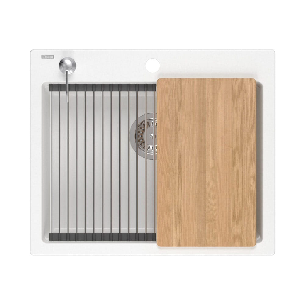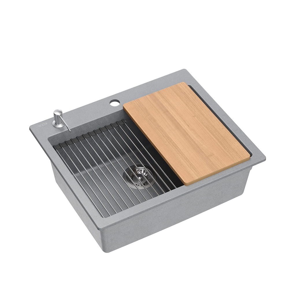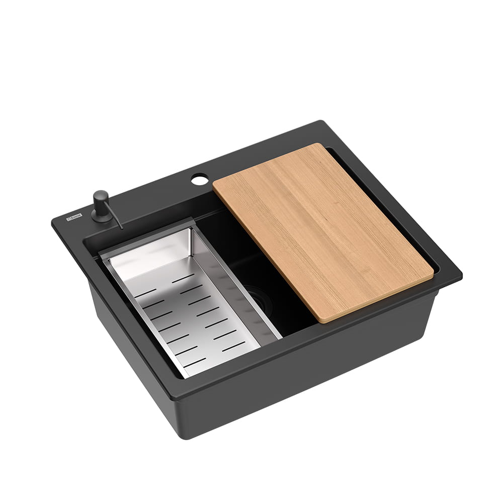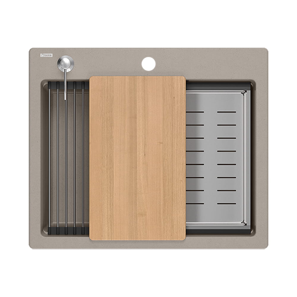 W skład zestawu wchodzą: zlewozmywak, drewniana deska, zwijana Qmata, stalowa wkładka, dozownik.