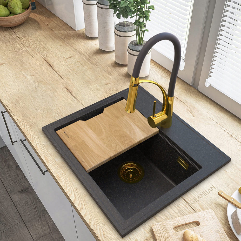 *W zestawie również dedykowana wkładka drewniana wykonana z lameli bukowych łączonych na mikro wczep. Zabezpieczona naturalnym olejem lnianym, dzięki czemu zyskała odporność mechaniczną oraz odporność na wpływ warunków zewnętrznych (wilgoć, woda). Zarówno rozmiar, jak i kształt zostały dopasowane stylistycznie do zlewu, aby razem tworzyć spójną całość.