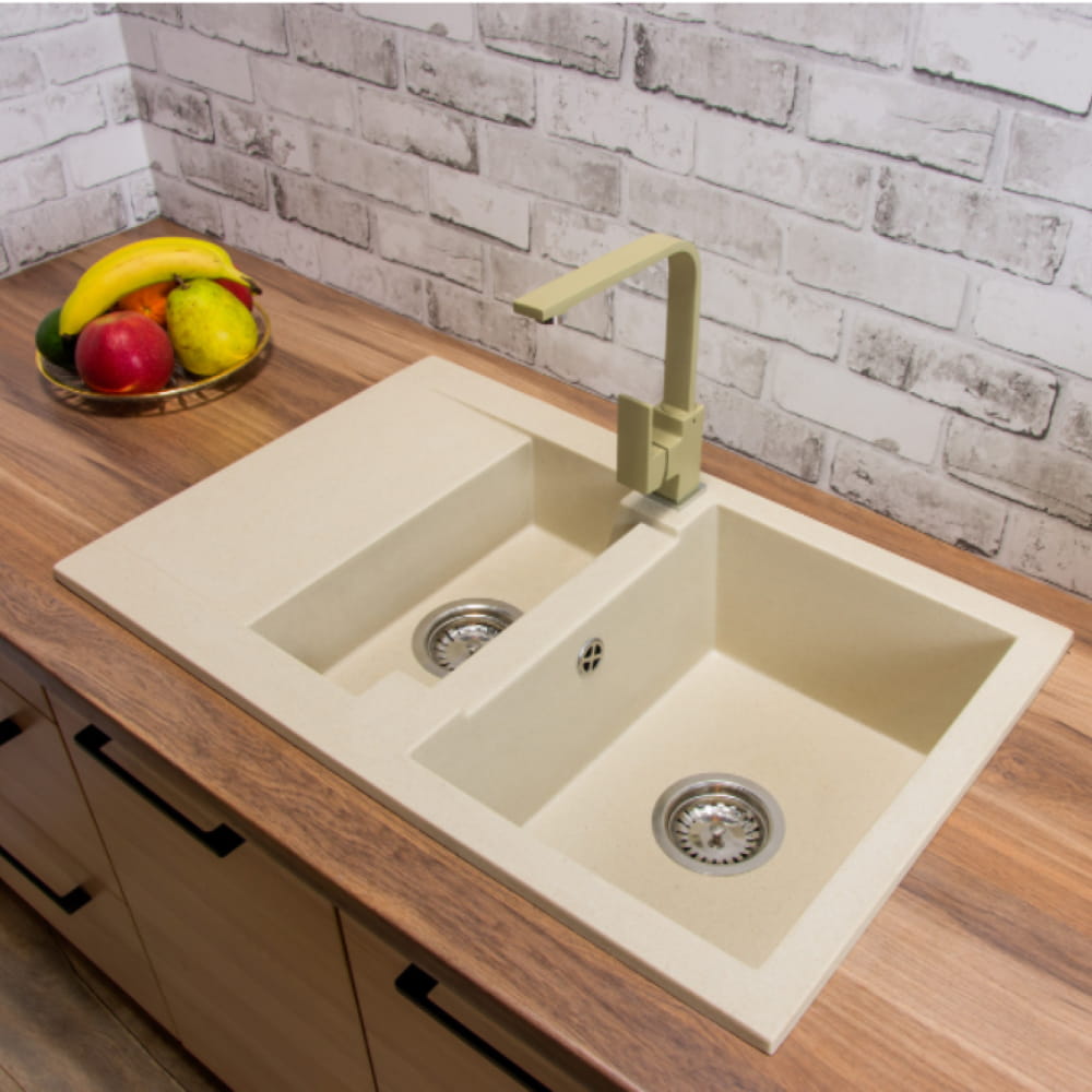 Zlewozmywak kuchenny półtorakomorowy z ociekaczem Doris wykonany z mieszanki granitu i spoiwa granitowego w stosunku 80% do 20%, co gwarantuje wysoką odporność na uszkodzenia mechaniczne, różnice temperatur oraz zarysowania. Można na nich bezpiecznie odłożyć gorące garnki o temperaturze do 280°C, a nawet olej jadalny o temperaturze około 180°C. Obniżony ociekacz to dodatkowy atut tego zlewozmywaka, który ułatwia odprowadzanie wody.