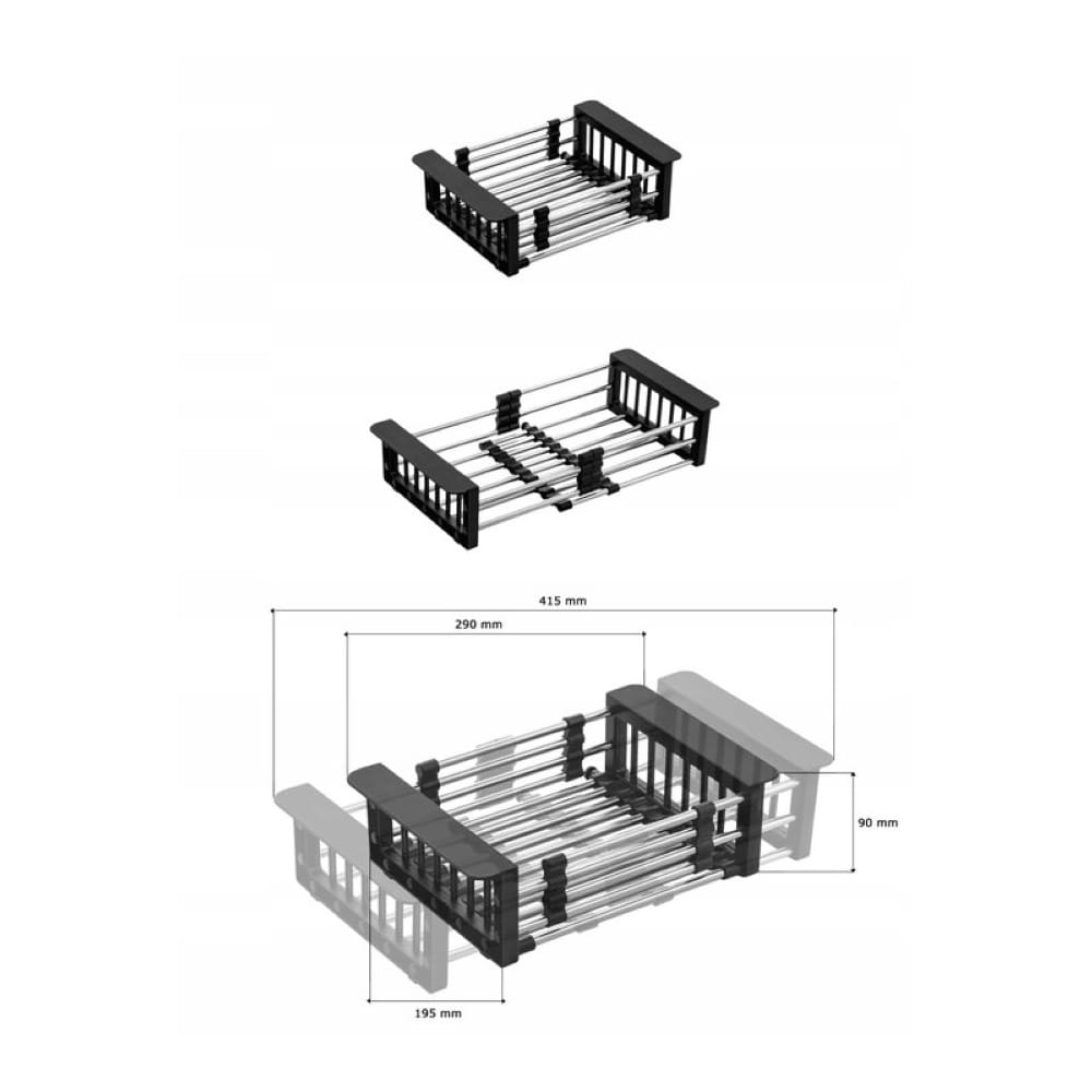 ● Teleskopowa ociekarka do zlewu. Wymiary (produkt złożony): 29 cm x 19,5 cm x 9 cm, maksymalne wymiary (po rozłożeniu): 41,5 cm x 19,5 cm x 9 cm.